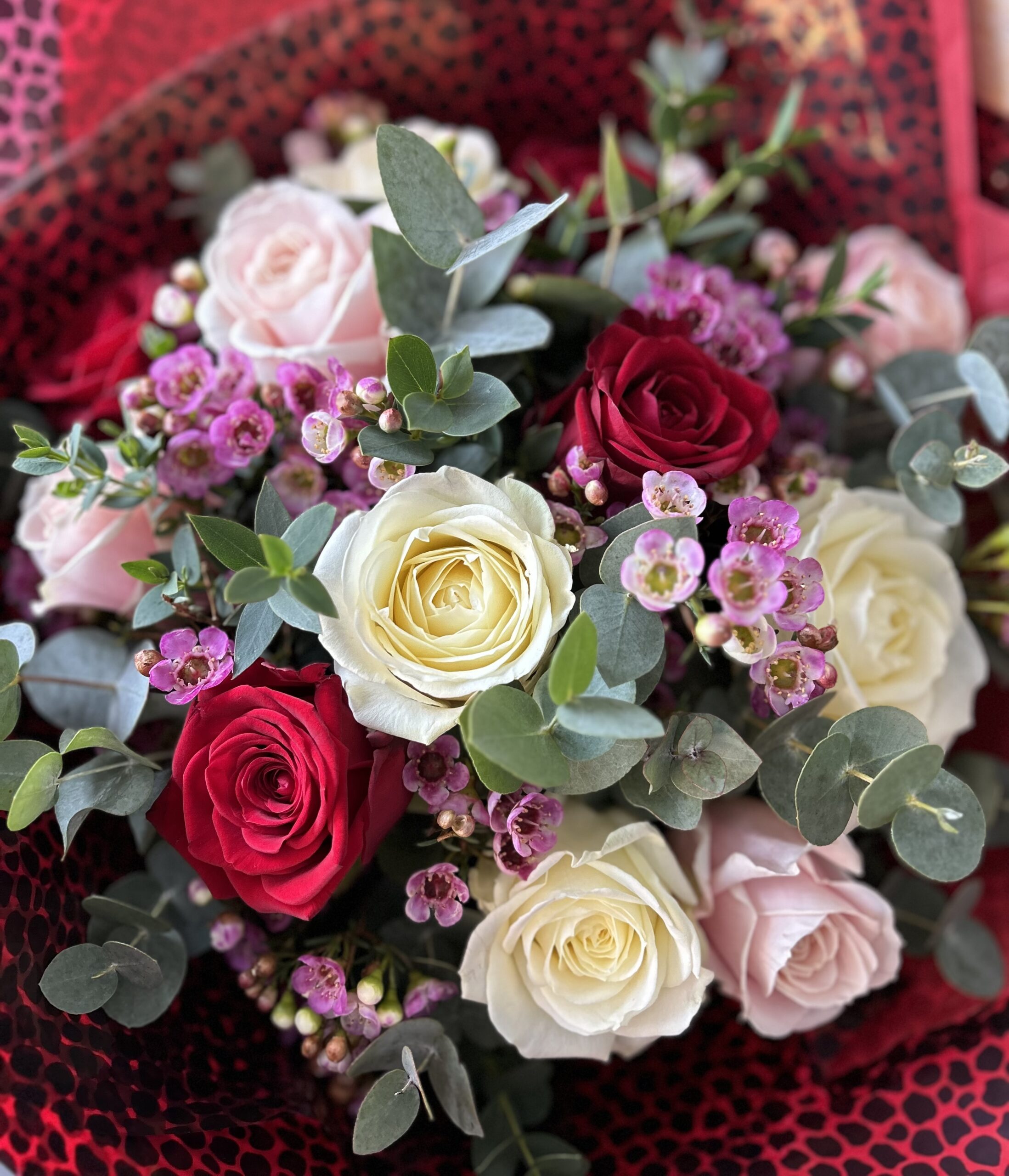 We love this beautiful selection of white, pink and red roses this Valentine’s. Delicately arranged with pink wax flower and foliages.