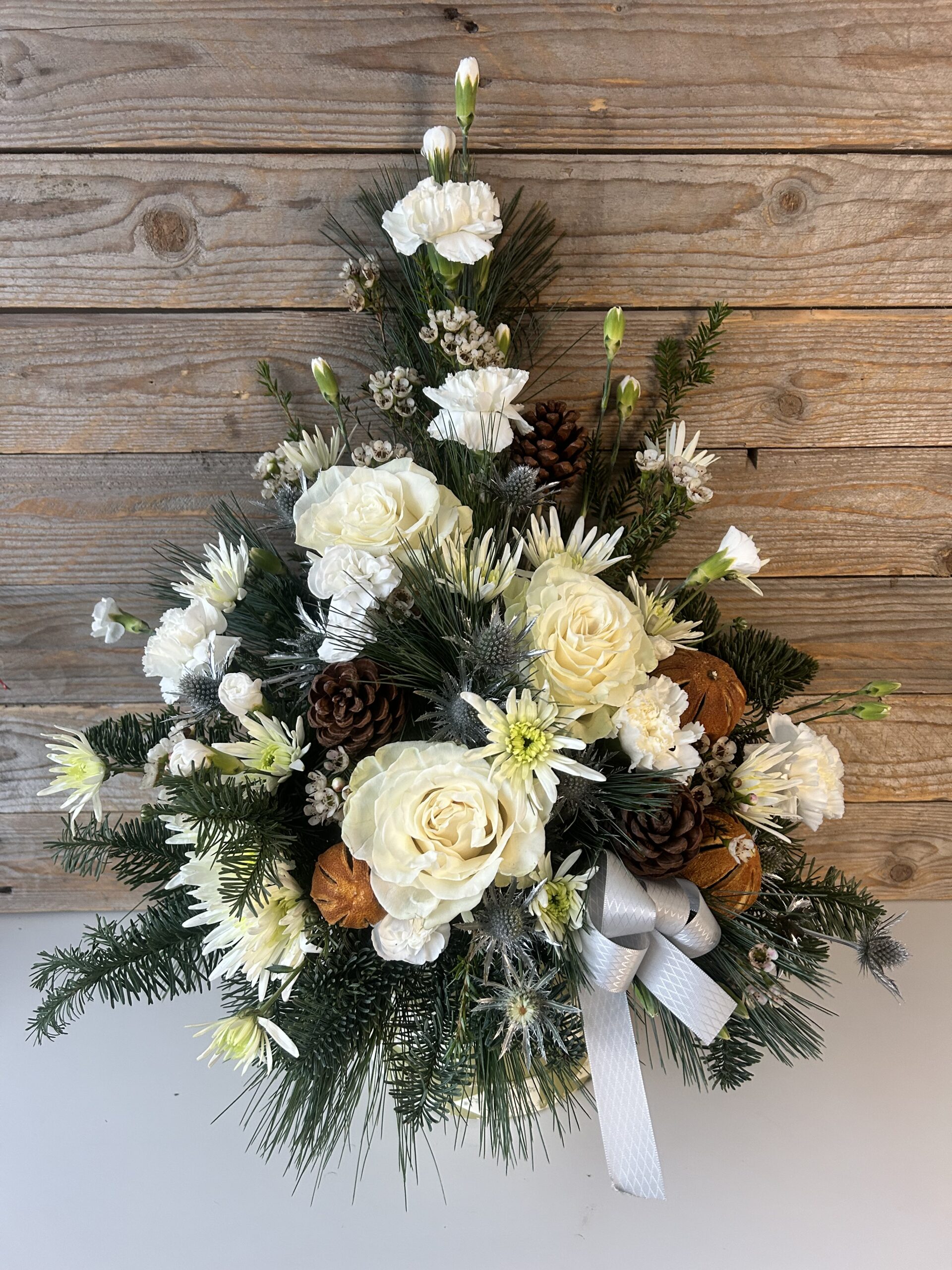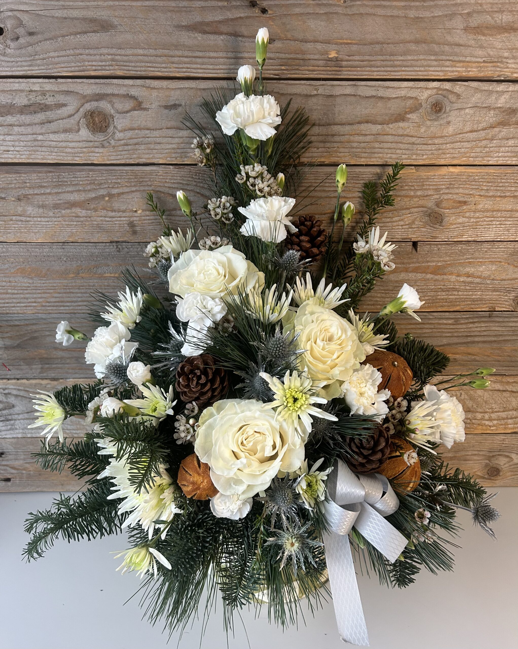 Designed to be front facing, this beautiful hatbox arrangement is filled with carnations, chrysanthemum, spray carnations, waxflower and roses. A little sprinkle of silver thistle and festive spruce makes this a truly wonderful design.
