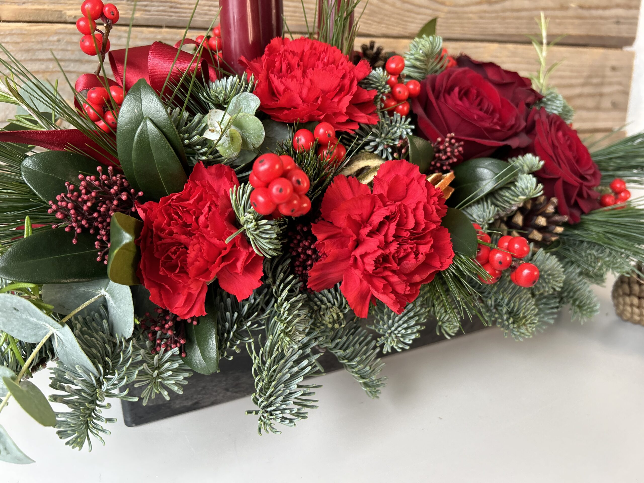 Filled with spruce, berries and gorgeous festive blooms, arranged around tapered red candles, this is such a beautiful gift.